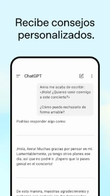Deja que ChatGPT despierte tu creatividad y potencie tu productividad. Genera ideas originales para ese regalo de cumpleaños perfecto o personaliza una felicitación especial que realmente impacte. Recibe asesoramiento a medida para formular una respuesta impecable o para navegar con claridad una situación compleja. La aplicación también es tu mentor personal, capaz de simplificar conceptos complejos, como explicar la electricidad a un niño fascinado por los dinosaurios, o refrescar tu memoria sobre eventos históricos con explicaciones adaptadas a ti. Para los profesionales, ofrece una herramienta invaluable para la lluvia de ideas en campañas publicitarias o la estructuración de planes de negocio. Sumérgete en la experiencia que cautiva a millones y transforma tu interacción con la tecnología.